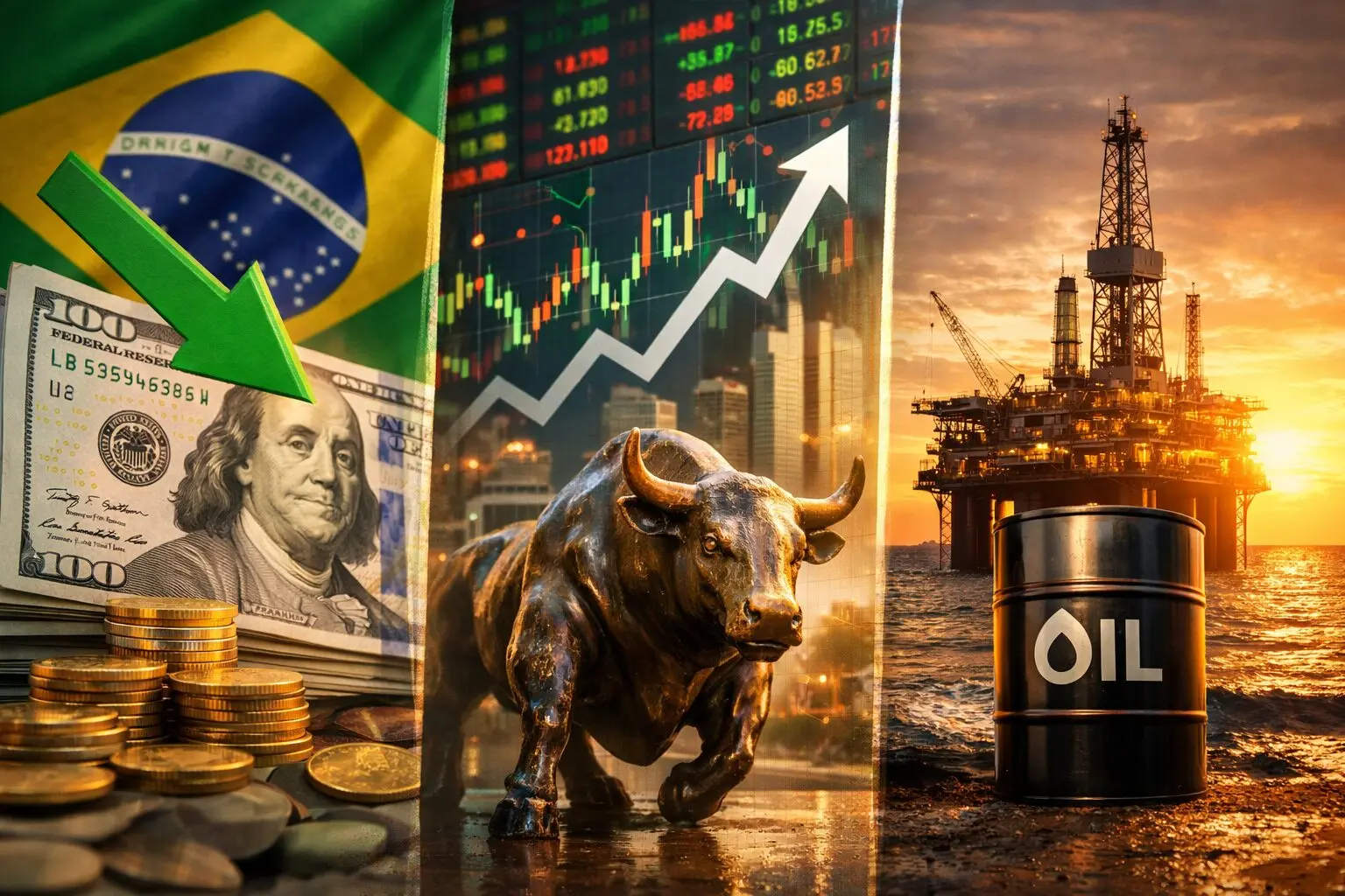 Com menor aversão ao risco, investidores reduzem posições defensivas em dólar e aumentam exposição a mercados emergentes. Esse fluxo favorece o real, especialmente em um ambiente de commodities ainda elevadas.